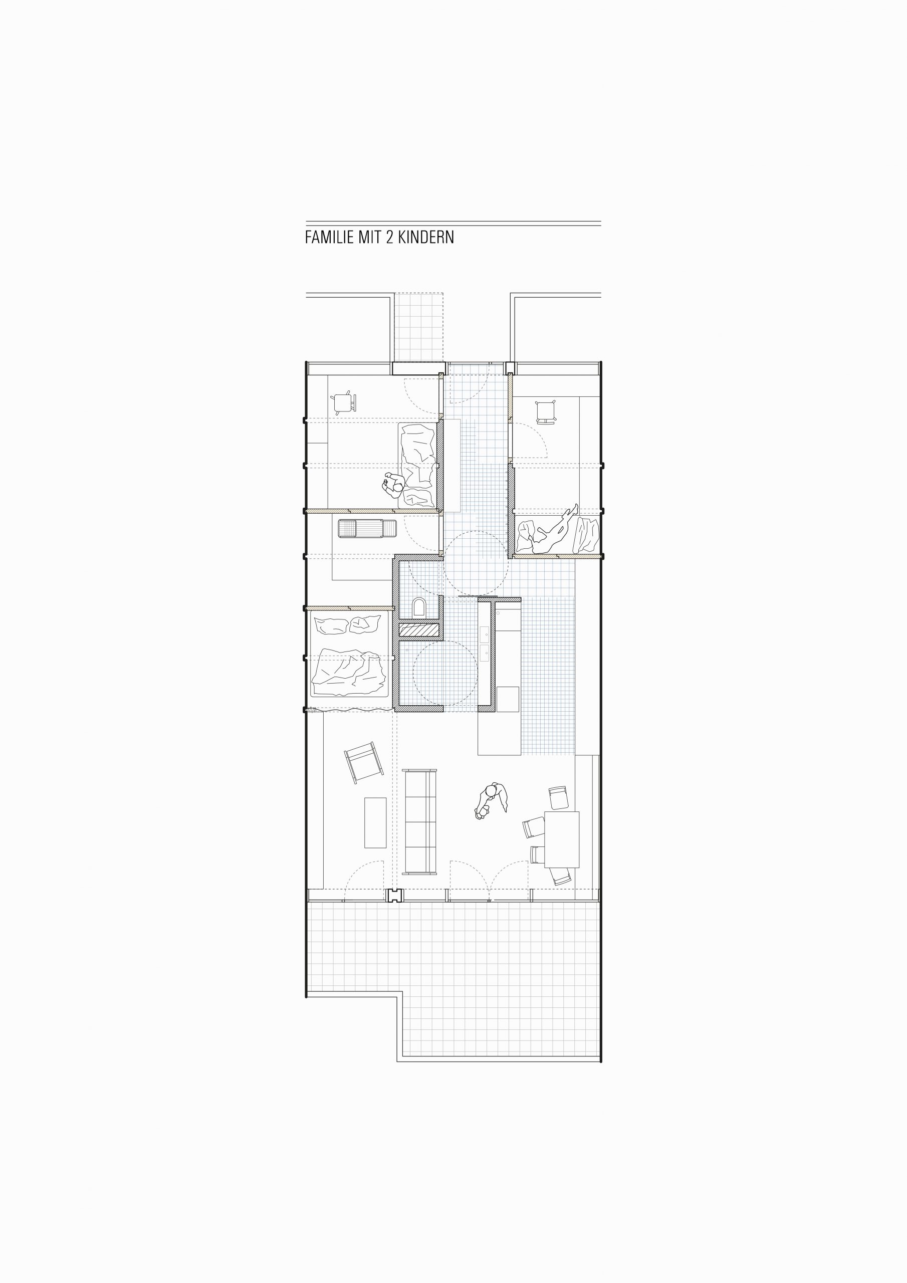 Innerhalb der Wohnungen möchten wir Rahmenbedingungen schaffen, die eine Grundwohnqualität garantieren, egal ob man auf gleicher Fläche alleine oder zu sechst wohnt. Was für den einen „Luxus“ ist, wird für den anderen zu leistbarem Wohnraum. Dies ermöglicht das verschiedenste Bewohner-Konstellationen mit unterschiedlichsten Hintergründen gemeinsam unter einem Dach leben. So kann es zu einer sozialen Durchmischung kommen, die heute wichtiger ist denn je und unsere Empathie anregt (Utopie?).