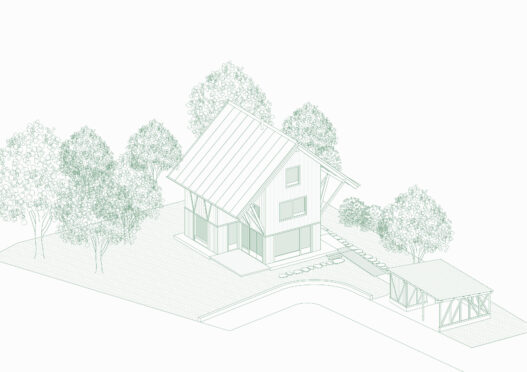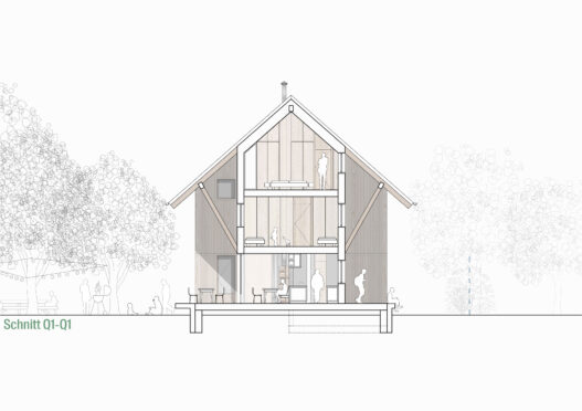 Um sich in seiner Proportion und Größe angemessen in das Stadtbild einzufügen, wurde das Gebäude in zwei getrennten, ineinander verschobenen Baukörpern ausformuliert. Die Kubatur der Häuser entspricht jener von zentral gelegenen Dornbirner Stadthäusern aus dem frühen 20. Jahrhundert. Auch das Thema der großzügigen eckseitigen Holzveranden nimmt Anleihen von diesem Bautypus.