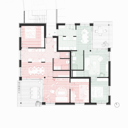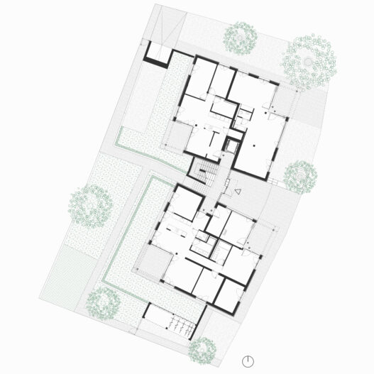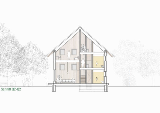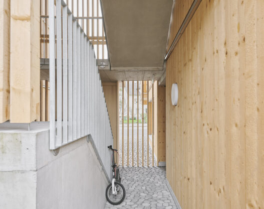 A central, weather-protected, open staircase, from which the individual floors can be reached, forms the access and connection between the two houses. In addition, a shared elevator provides barrier-free access to all areas.