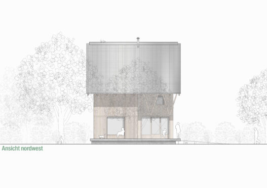 The building was constructed using a hybrid construction method. A reinforced concrete skeleton forms the basic structure and was filled with timber frame elements. The shell of the building is a rear-ventilated façade made of untreated spruce wood cladding.