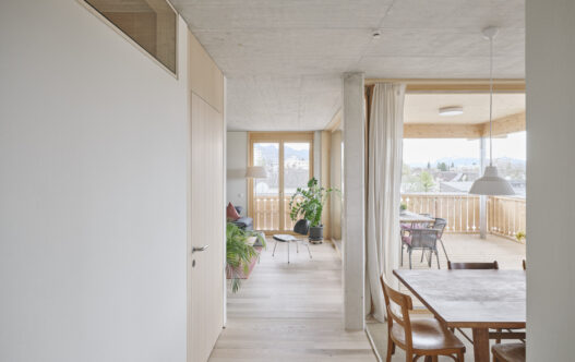 Die Bauweise ist auch im Inneren der Wohnungen deutlich spürbar. Die tragenden Säulen und Decken aus Beton wurden auf Sicht belassen und machen die Struktur des Gebäudes lesbar.