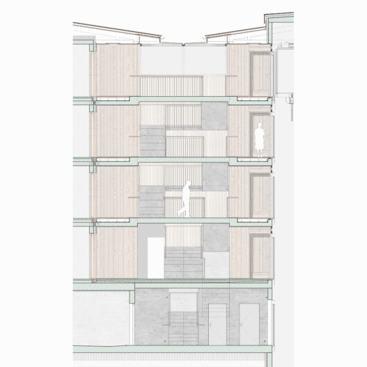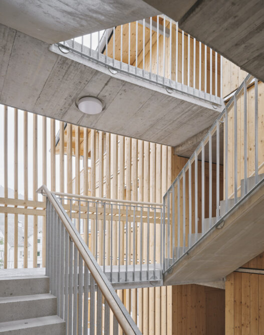 Den Zugang und die Verbindung der beiden Häuser bildet ein zentrales, witterungsgeschütztes, offenes Stiegenhaus, von dem aus die einzelnen Geschoße erreicht werden können. Außerdem bietet ein gemeinsam genutzter Aufzug die Möglichkeit, alle Bereiche auch barrierefrei zu erreichen.