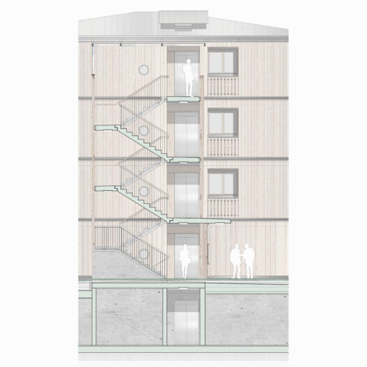 Errichtet wurde ein viergeschoßiger Wohnbau mit 14 Wohneinheiten. Im Erdgeschoß befindet sich ein Geschäftslokal sowie Gemeinschaftsflächen in Form eines Fahrradraumes und einer kleinen Werkstatt, mit direktem Bezug zum Straßenraum.