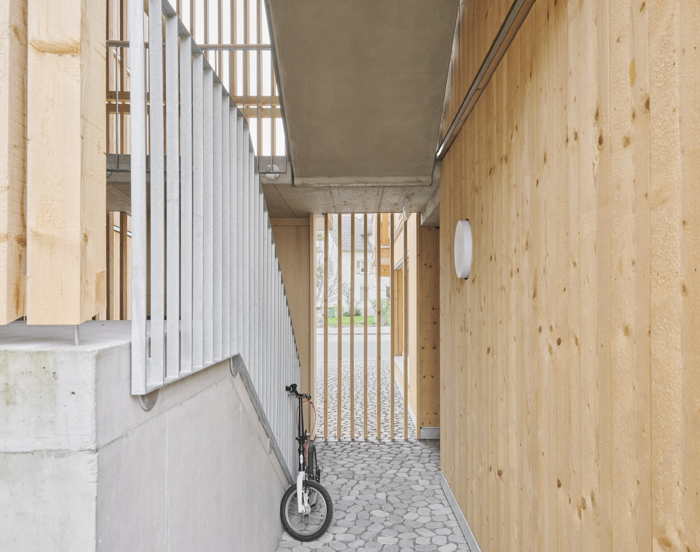 Den Zugang und die Verbindung der beiden Häuser bildet ein zentrales, witterungsgeschütztes, offenes Stiegenhaus, von dem aus die einzelnen Geschoße erreicht werden können. Außerdem bietet ein gemeinsam genutzter Aufzug die Möglichkeit, alle Bereiche auch barrierefrei zu erreichen.