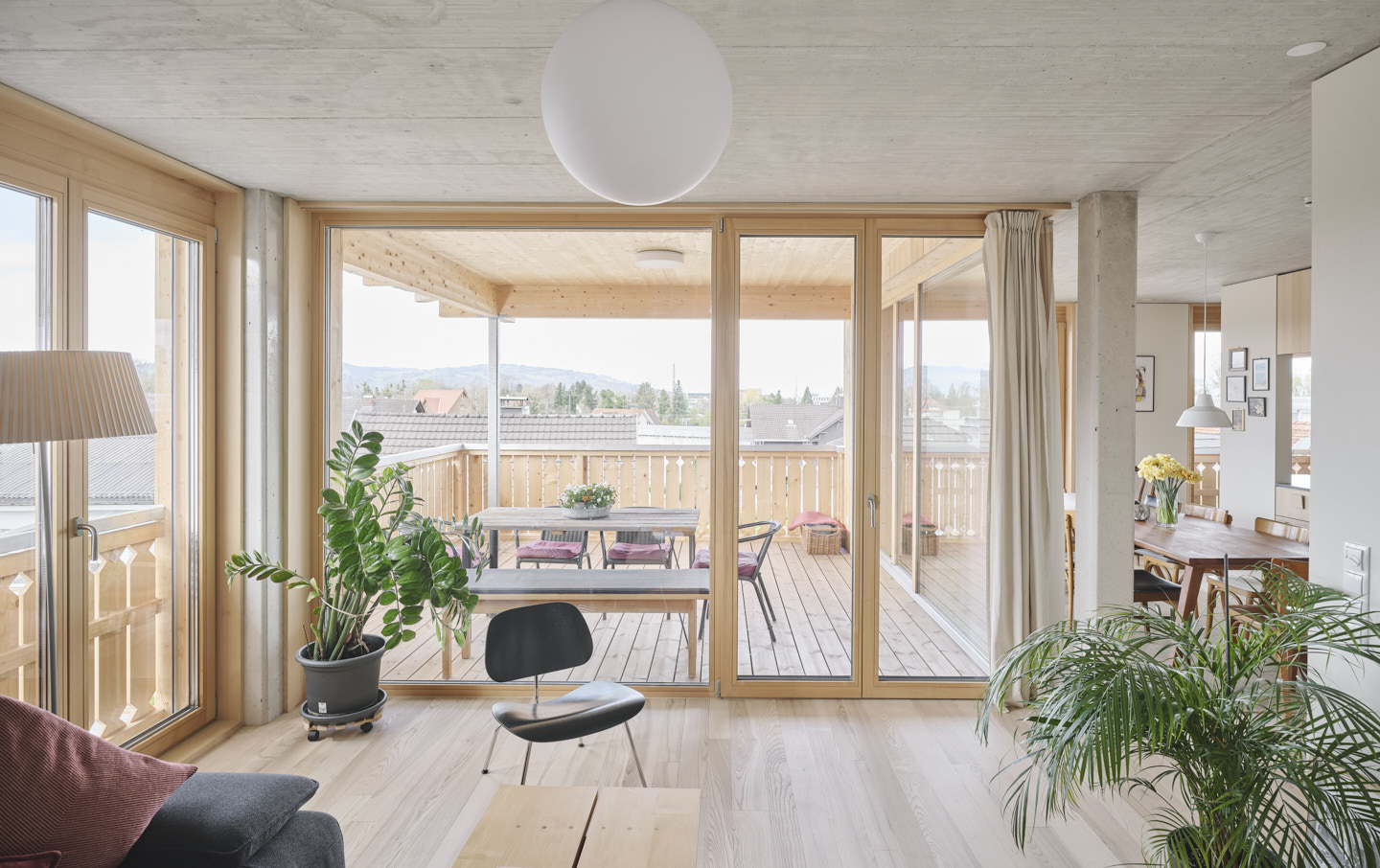 Die Bauweise ist auch im Inneren der Wohnungen deutlich spürbar. Die tragenden Säulen und Decken aus Beton wurden auf Sicht belassen und machen die Struktur des Gebäudes lesbar.