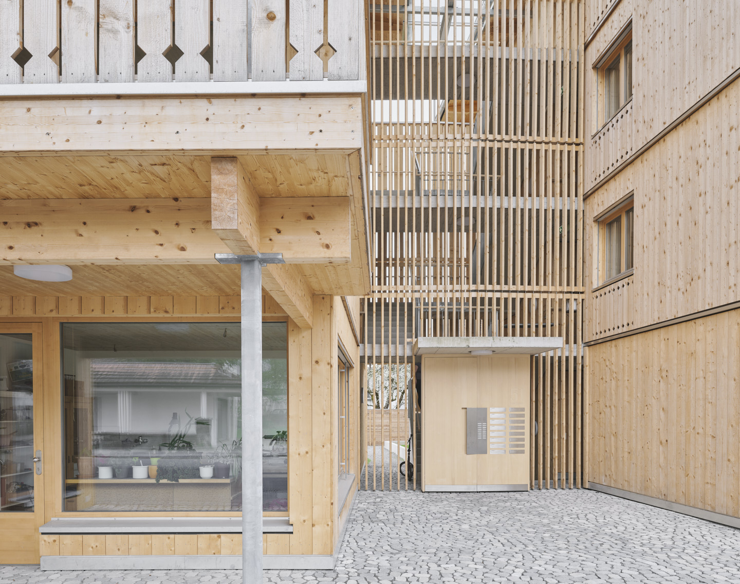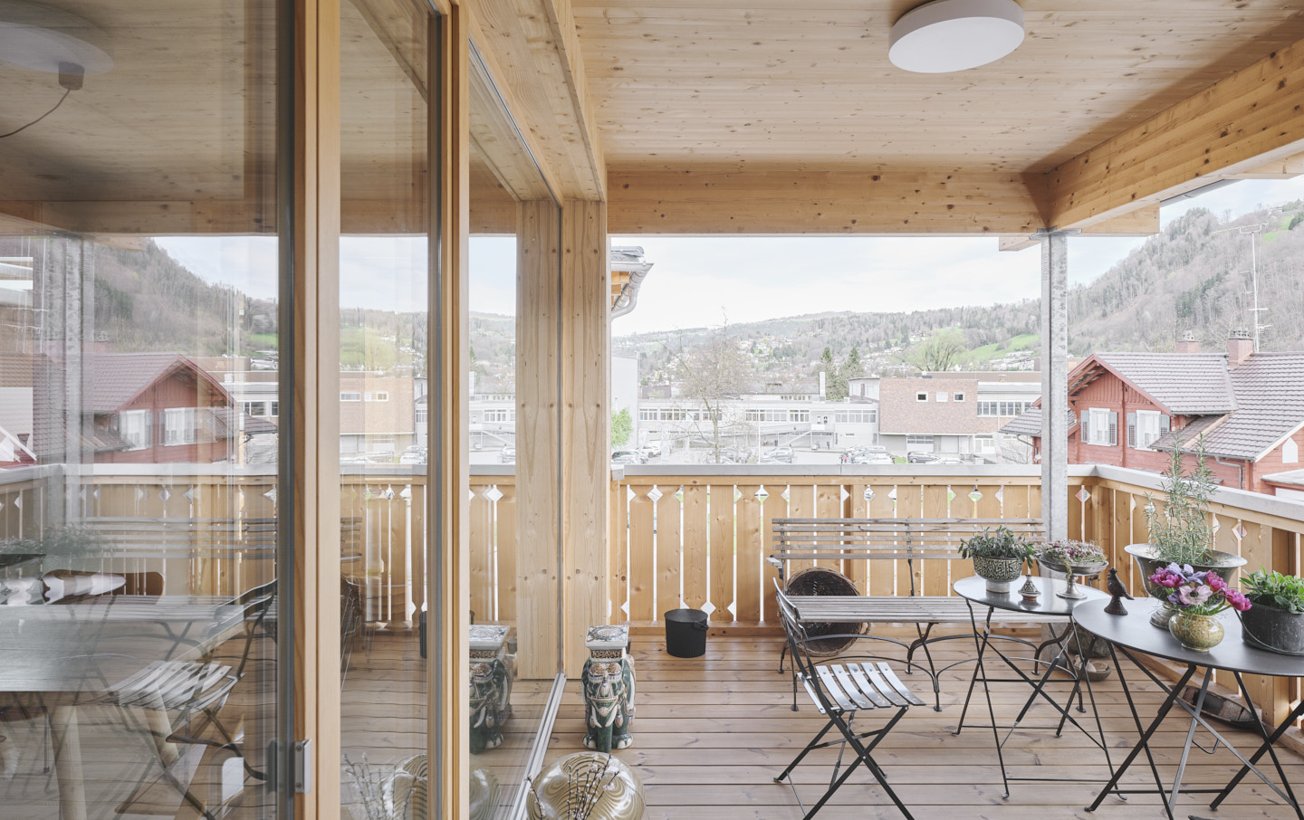 In order to blend in appropriately with the cityscape in terms of its proportions and size, the building was designed as two separate, interlocking structures. The cubature of the houses corresponds to that of centrally located Dornbirn townhouses from the early 20th century. The theme of the spacious corner wooden verandas also borrows from this type of building.