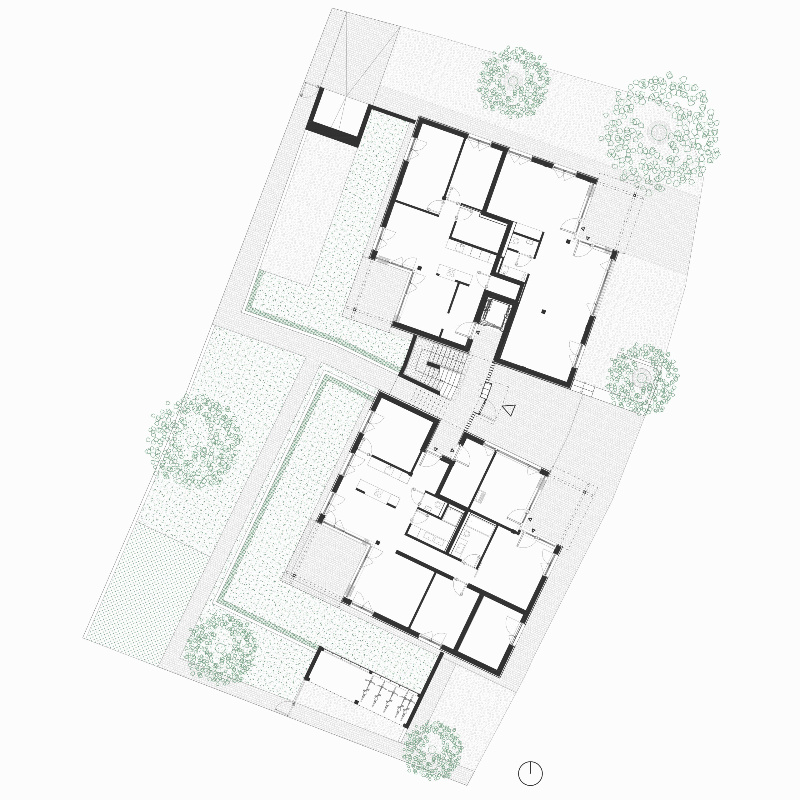 Neben zwei Wohnungen mit Eigengarten im Erdgeschoß befinden sich in jedem weiteren Geschoß jeweils vier Wohnungen: Zwei ruhigere größere Einheiten in Richtung Garten sowie zwei kleinere urbanere Wohnungen auf Seite der Eisengasse.