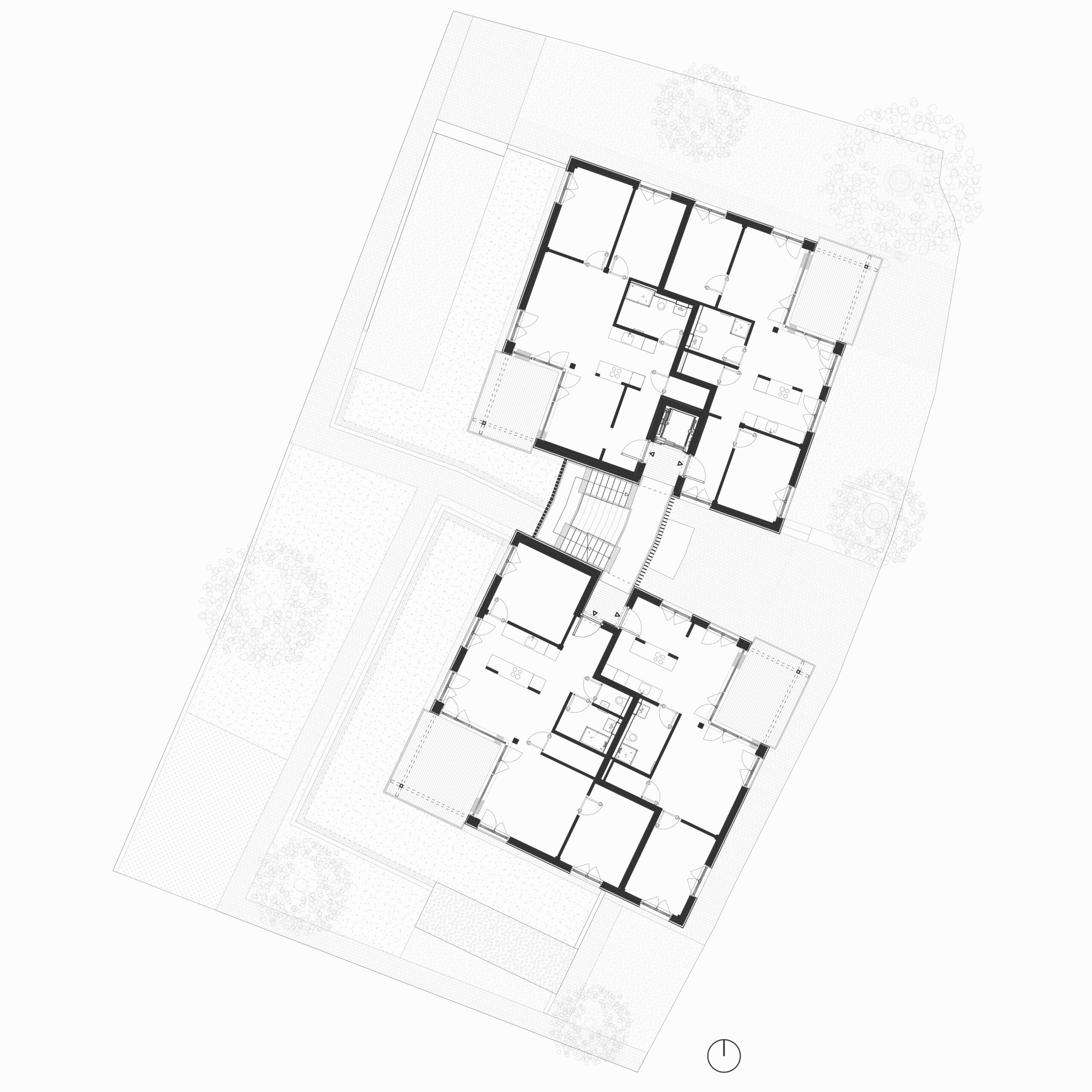 A central, weather-protected, open staircase, from which the individual floors can be reached, forms the access and connection between the two houses. In addition, a shared elevator provides barrier-free access to all areas.